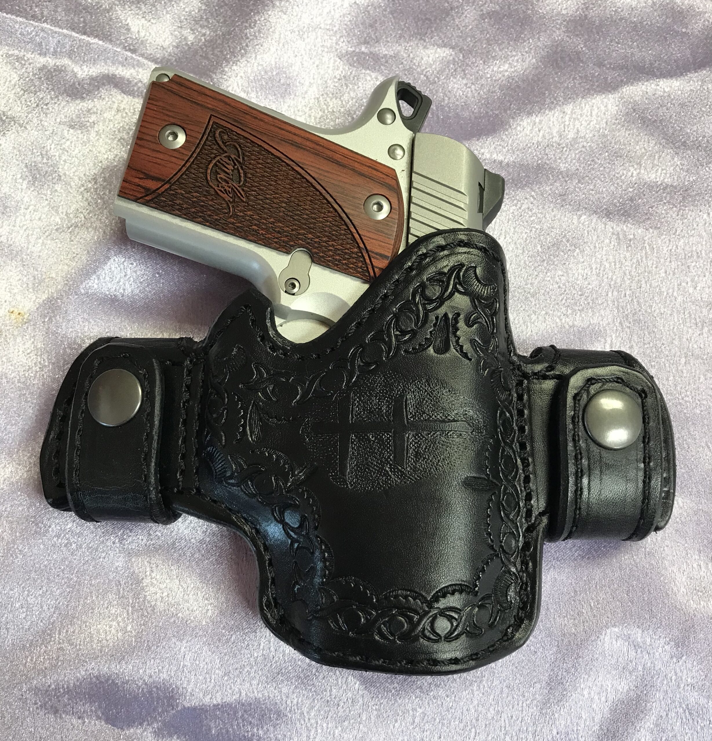 This little beauty is shown with a Kimber micro, so it can take either weapon- this holster