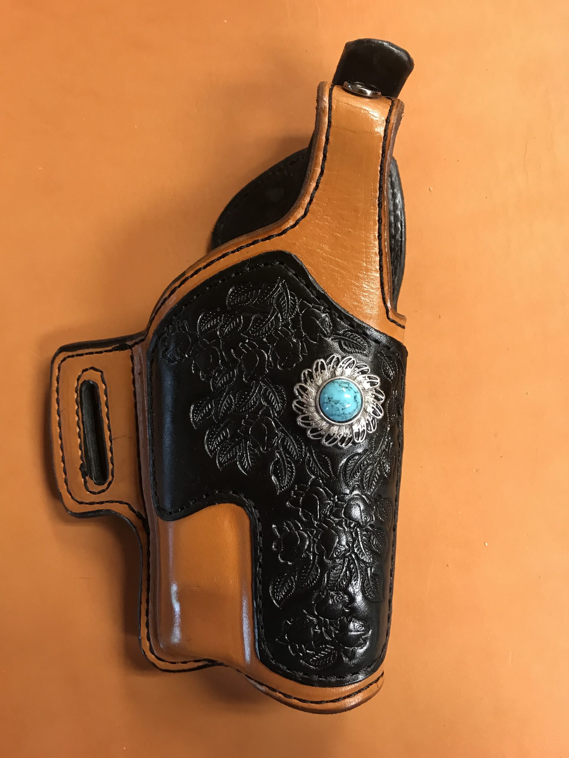 Another incredible holster, this is a two-tone with a full-tool overlay and a concho – (call for pricing)