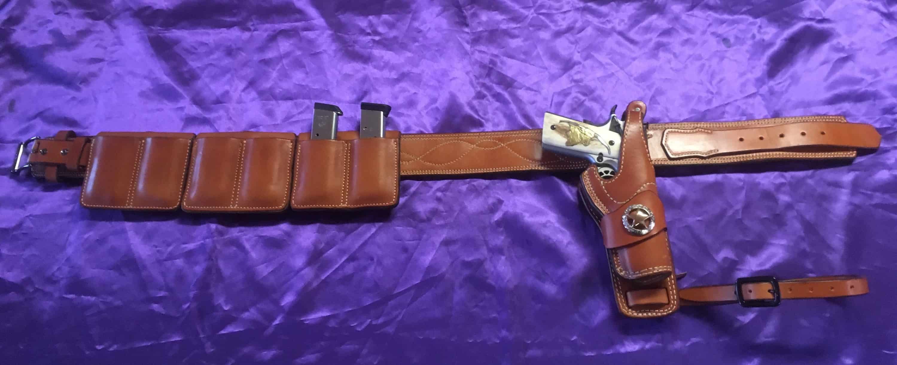 This is our version of the rig used by Dutch Engstrom (Earnest Borgnine) in the movie The Custom Open Carry. This particular rig has a triple-double set of mag pouches, extra double mags add 75.ea