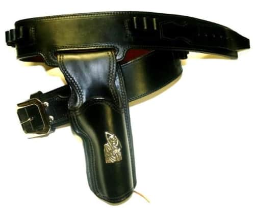 The Grim Reaper shown here in stunning black, (you can of course have any color we offer) in a drop-loop belt style. This rig is a part of our specialty group that includes a Sterling silver carved ‘reaper’ inlaid by artist Walt Marston, making it a real stand-out for any serious Old West aficionado.