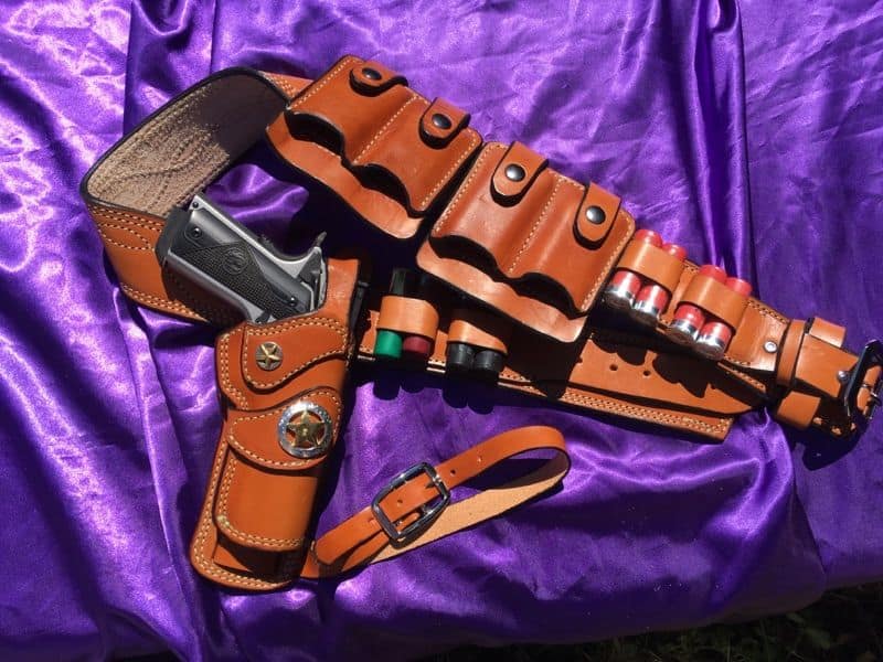8 shotgun loops of your caliber choice, this customer asked for two double detachable straight mag pouches (one double mag is included in the price), decorative stitching in the back, holster flap