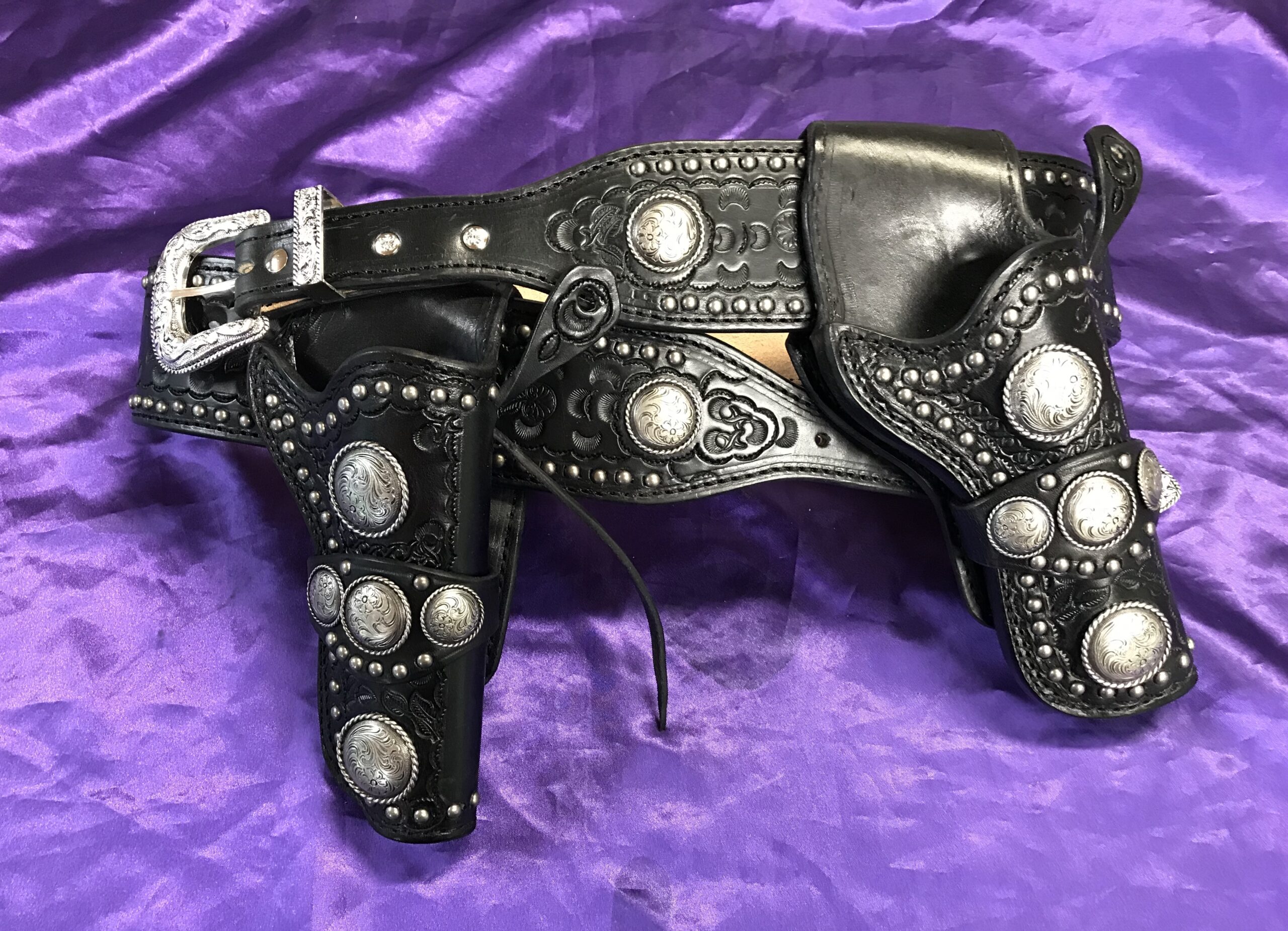 With 12 large silver conchos and over 200 small studs meticulously tapped one at a time, no machine for that.